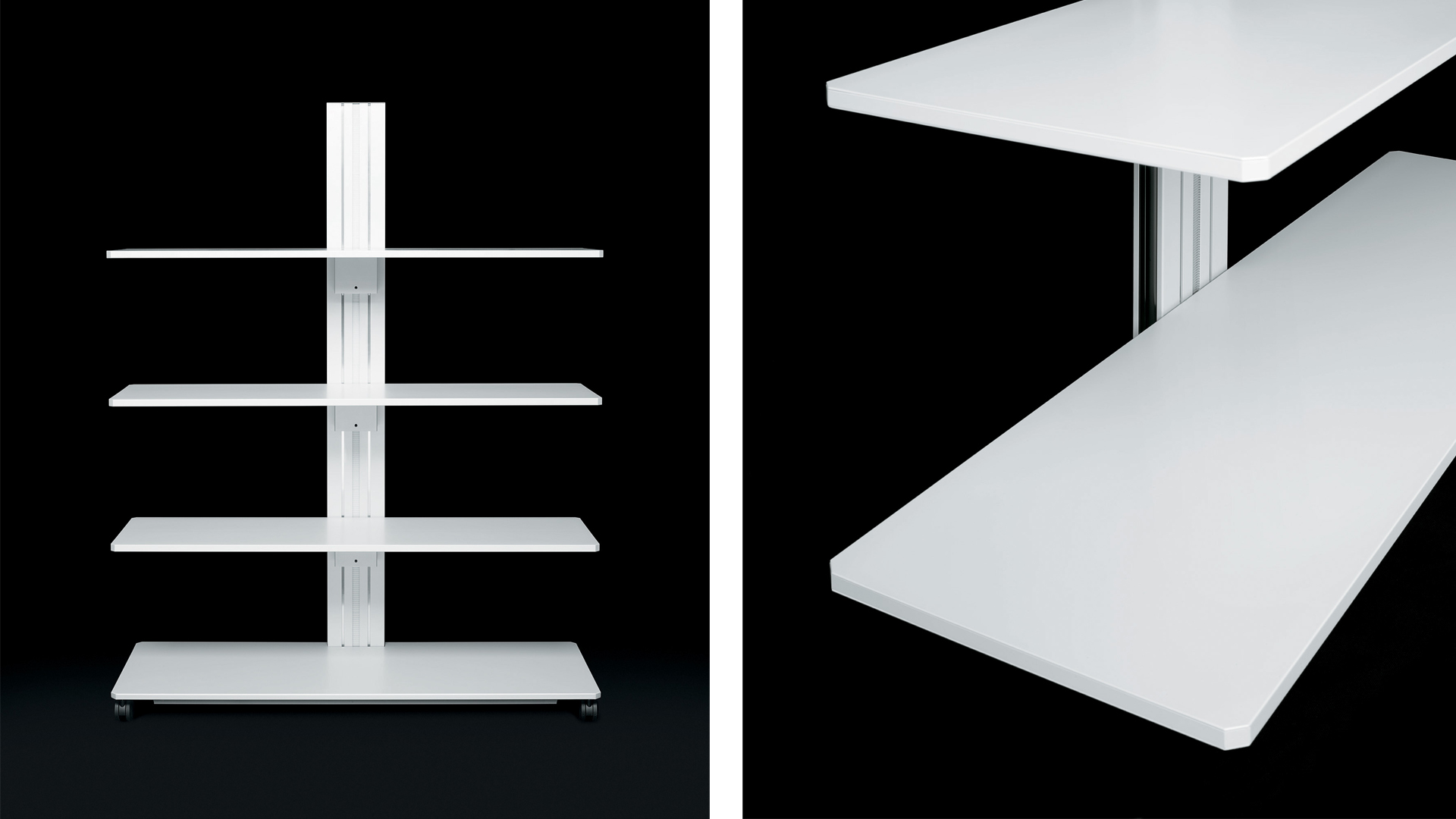 Programma di carrelli polifunzionali per dotazioni multimediali, postazioni informatiche mobili e strumentazioni di servizio. Flessibili, funzionali e qualificati da un design estremamente essenziale, questi elementi di complemento sono pensati per rispondere alle necessità di un ambiente in continua evoluzione, dove convivono attività operative e di relazione. Disponibili in tre altezze, i carrelli sono costituiti da una solida struttura metallica, che nasconde semplici meccanismi di regolazione; basamento con vano ispezionabile dotato di prese di allacciamento alle reti, facilmente accessibile mediante lo scorrimento del ripiano di chiusura; piani di appoggio che si alzano e si abbassano, anche con le apparecchiature già posizionate; speciali ruote a sfera coassiali, che garantiscono elevate prestazioni di stabilità (da fermo e in movimento).
